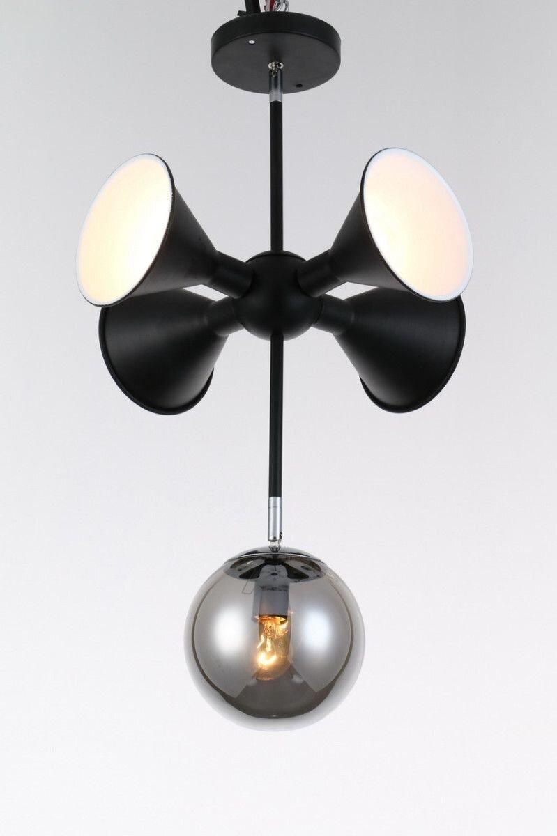 Каркас виготовлений з металу чорного кольору, що надає йому загадкового шарму. Цілком унікальною особливістю є 5 плафонів: 4 плафони з металу, що додають люстрі сміливості та сучасності, і один круглий плафон зі скла в хромовому відтінку, який надає цілому дизайну нотку ексклюзивності.
