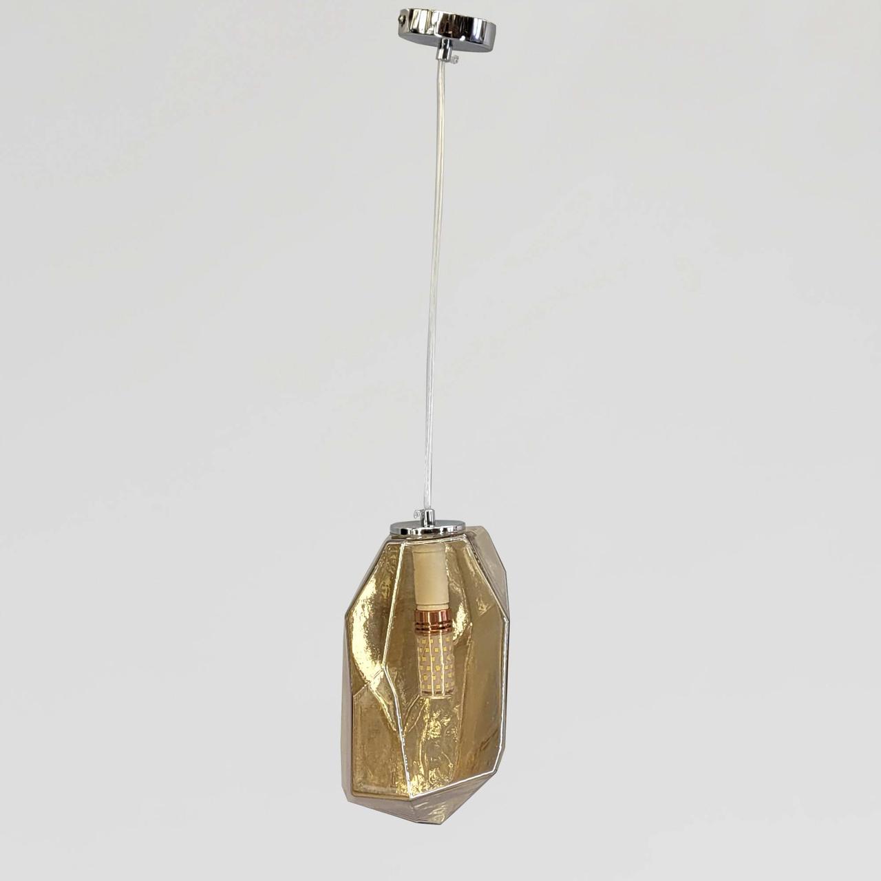 Тип джерела освітлення: E14 (без лампи в комплекті) Кількість джерел світла: 1 Колір основи: хром Матеріал плафона: скло Колір плафона: медовий Ширина плафона: 16 см Тип кріплення на стелю: планка 7,4 см Розмір стельової чашки: діаметр 8 см, висота 2 см Висота елемента регулюється. Висота підвісу: 27 см Висота максимальна: 219 см Вага: 1,050 кг Гарантія 12 місяців